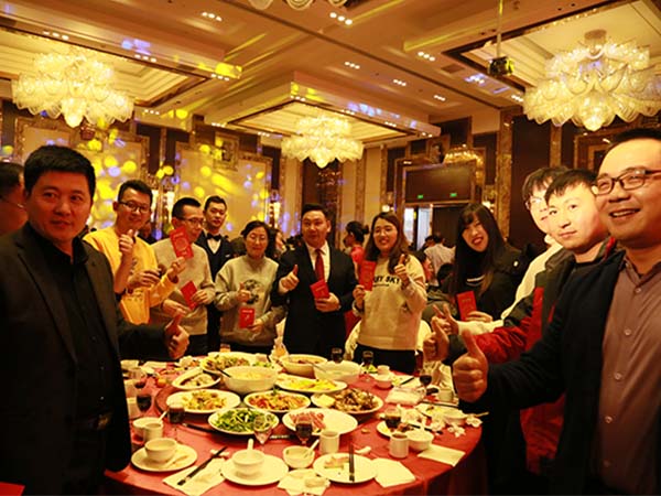 年會在主辦方青島康景輝科技集團的董事長夏和斌先生和巖康集團董事長夏和義先生的演講中開始,接下來就是各公司組織的文藝匯演以及抽獎環節,整場文藝匯演及抽獎便在這歡聲笑語中圓滿落幕,豐盛的飯菜也端上了桌,盛典迎來午宴環節。宴會期間,董事長夏和義先生親自為到場的所有員工發放紅包并送上了新年祝福,合影留念,現場氣氛迎來巔峰。